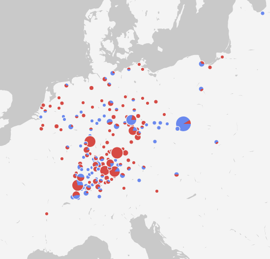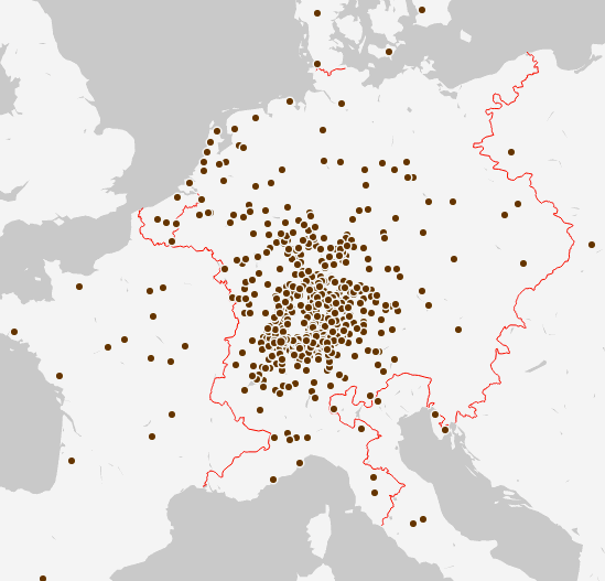 Gelehrte der Universität Basel 1460-1550. Herkunfts- und Kommunikationsräume (braun), Studienorte (blau), Tätigkeiten (rot). Dieses Szenario interaktiv: Dieses Szenario interaktiv: https://database.rag-online.org/viewer.p/9/25/scenario/694/geo