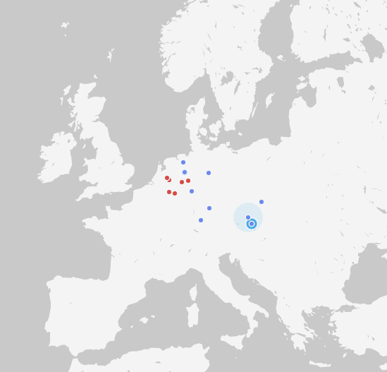 Herkunfts- und Kommunikationsräume: Gelehrte der Universitäten Köln (rot) und Wien (blau) 1365-1550.
